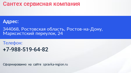 Сантех, сервисная компания по адресу 344068, Ростовская область, Ростов-на-Дону, Марксистский переулок, 24 в дальнейшем Организация, размещена в следующих категориях: