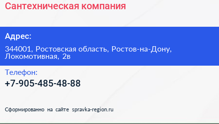 Сантехническая компания по адресу 344001, Ростовская область, Ростов-на-Дону, Локомотивная, 2в в дальнейшем Организация, размещена в следующих категориях: