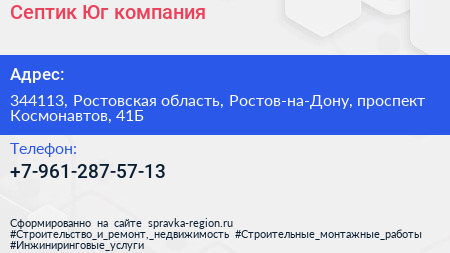 Септик-Юг, компания по адресу 344113, Ростовская область, Ростов-на-Дону, проспект Космонавтов, 41Б в дальнейшем Организация, размещена в следующих категориях: