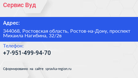 Сервис Вуд по адресу 344068, Ростовская область, Ростов-на-Дону, проспект Михаила Нагибина, 32/2в в дальнейшем Организация, размещена в следующих категориях: