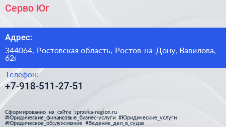 Серво-Юг по адресу 344064, Ростовская область, Ростов-на-Дону, Вавилова, 62г в дальнейшем Организация, размещена в следующих категориях: