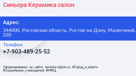 Синьора Керамика, салон по адресу 344000, Ростовская область, Ростов-на-Дону, Малюгиной, 220 в дальнейшем Организация, размещена в следующих категориях: