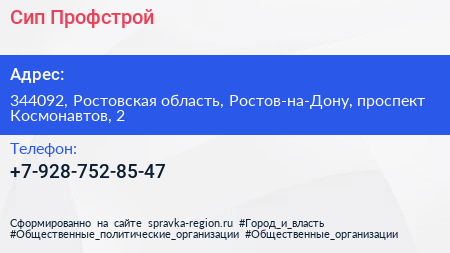 Сип Профстрой по адресу 344092, Ростовская область, Ростов-на-Дону, проспект Космонавтов, 2 в дальнейшем Организация, размещена в следующих категориях: