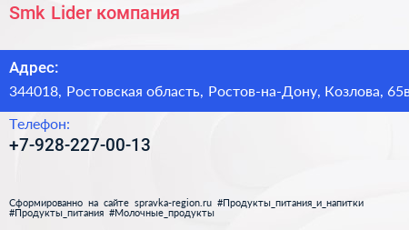 Smk-Lider, компания по адресу 344018, Ростовская область, Ростов-на-Дону, Козлова, 65в в дальнейшем Организация, размещена в следующих категориях: