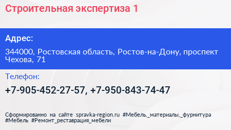 Строительная экспертиза №1 по адресу 344000, Ростовская область, Ростов-на-Дону, проспект Чехова, 71 в дальнейшем Организация, размещена в следующих категориях: