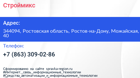 Строймикс по адресу 344094, Ростовская область, Ростов-на-Дону, Можайская, 40 в дальнейшем Организация, размещена в следующих категориях: