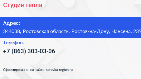 Студия тепла по адресу 344038, Ростовская область, Ростов-на-Дону, Нансена, 239 в дальнейшем Организация, размещена в следующих категориях: