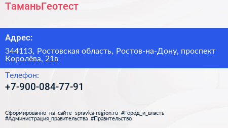 ТаманьГеотест по адресу 344113, Ростовская область, Ростов-на-Дону, проспект Королёва, 21в в дальнейшем Организация, размещена в следующих категориях: