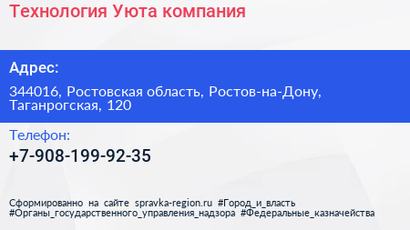 Технология Уюта, компания по адресу 344016, Ростовская область, Ростов-на-Дону, Таганрогская, 120 в дальнейшем Организация, размещена в следующих категориях: