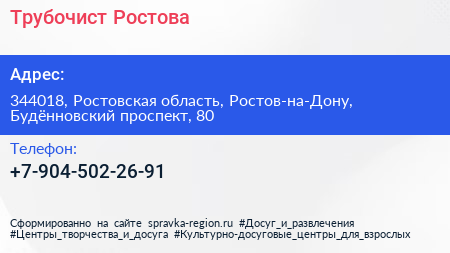 Трубочист Ростова по адресу 344018, Ростовская область, Ростов-на-Дону, Будённовский проспект, 80 в дальнейшем Организация, размещена в следующих категориях: