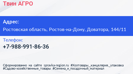 Твин АГРО по адресу Ростовская область, Ростов-на-Дону, Доватора, 144/11 в дальнейшем Организация, размещена в следующих категориях: