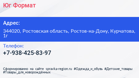 Юг Формат по адресу 344020, Ростовская область, Ростов-на-Дону, Курчатова, 1г в дальнейшем Организация, размещена в следующих категориях:
