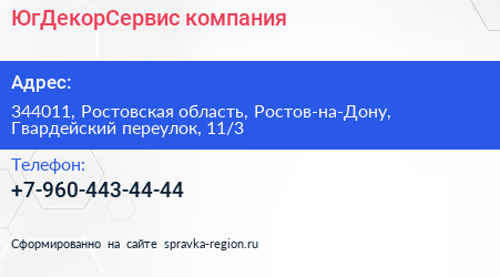 ЮгДекорСервис, компания по адресу 344011, Ростовская область, Ростов-на-Дону, Гвардейский переулок, 11/3 в дальнейшем Организация, размещена в следующих категориях: