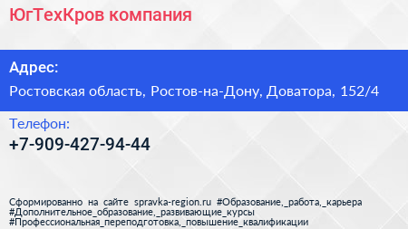 ЮгТехКров, компания по адресу Ростовская область, Ростов-на-Дону, Доватора, 152/4 в дальнейшем Организация, размещена в следующих категориях: