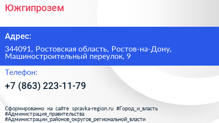 Южгипрозем по адресу 344091, Ростовская область, Ростов-на-Дону, Машиностроительный переулок, 9 в дальнейшем Организация, размещена в следующих категориях: