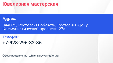 Ювелирная мастерская по адресу 344091, Ростовская область, Ростов-на-Дону, Коммунистический проспект, 27а в дальнейшем Организация, размещена в следующих категориях: