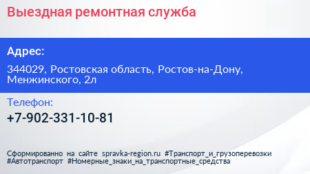 Выездная ремонтная служба по адресу 344029, Ростовская область, Ростов-на-Дону, Менжинского, 2л в дальнейшем Организация, размещена в следующих категориях:
