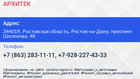 Для связи с организацией воспользуйтесь номером телефона: +7 (863) 283-11-11, +7-928-227-43-33. Пн: c 09:00-18:00, Вт: c 09:00-18:00, Ср: c 09:00-18:00, Чт: c 09:00-18:00, Пт: c 09:00-18:00, Сб: c 10:00-14:00, Вс: выходной. по предварительной записи: пн-сб, вы можете обратиться в эту организацию.