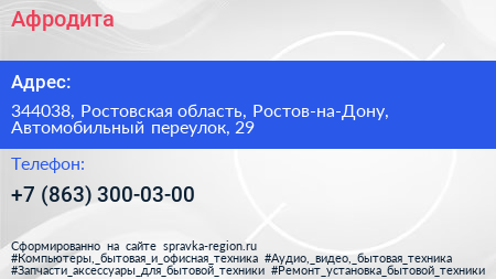Афродита по адресу 344038, Ростовская область, Ростов-на-Дону, Автомобильный переулок, 29 в дальнейшем Организация, размещена в следующих категориях: