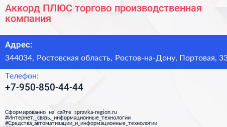 Аккорд-ПЛЮС, торгово-производственная компания по адресу 344034, Ростовская область, Ростов-на-Дону, Портовая, 33 в дальнейшем Организация, размещена в следующих категориях: