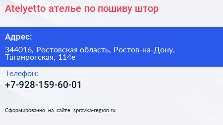 Atelyetto, ателье по пошиву штор по адресу 344016, Ростовская область, Ростов-на-Дону, Таганрогская, 114е в дальнейшем Организация, размещена в следующих категориях: