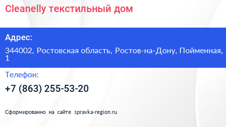 Cleanelly, текстильный дом по адресу 344002, Ростовская область, Ростов-на-Дону, Пойменная, 1 в дальнейшем Организация, размещена в следующих категориях: