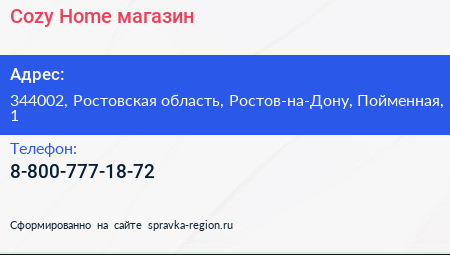 Cozy Home, магазин по адресу 344002, Ростовская область, Ростов-на-Дону, Пойменная, 1 в дальнейшем Организация, размещена в следующих категориях: