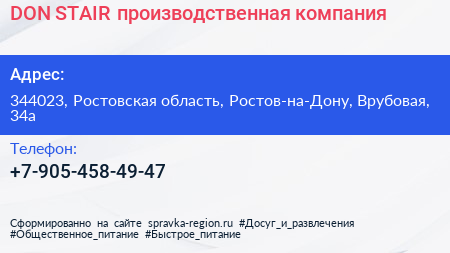 DON STAIR, производственная компания по адресу 344023, Ростовская область, Ростов-на-Дону, Врубовая, 34а в дальнейшем Организация, размещена в следующих категориях: