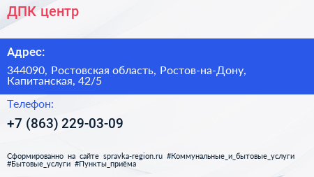 ДПК центр по адресу 344090, Ростовская область, Ростов-на-Дону, Капитанская, 42/5 в дальнейшем Организация, размещена в следующих категориях: