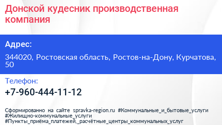 Для связи с организацией воспользуйтесь номером телефона: +7-960-444-11-12. Ежедневно с 08:00 до 22:00, вы можете обратиться в эту организацию.
