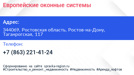 Европейские оконные системы по адресу 344069, Ростовская область, Ростов-на-Дону, Таганрогская, 117 в дальнейшем Организация, размещена в следующих категориях: