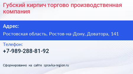 Губский кирпич, торгово-производственная компания по адресу Ростовская область, Ростов-на-Дону, Доватора, 141 в дальнейшем Организация, размещена в следующих категориях: