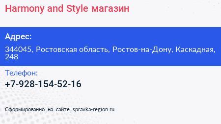Harmony and Style, магазин по адресу 344045, Ростовская область, Ростов-на-Дону, Каскадная, 248 в дальнейшем Организация, размещена в следующих категориях: