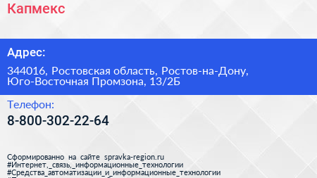 Капмекс по адресу 344016, Ростовская область, Ростов-на-Дону, Юго-Восточная Промзона, 13/2Б в дальнейшем Организация, размещена в следующих категориях: