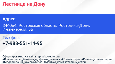 Лестница-на-Дону по адресу 344064, Ростовская область, Ростов-на-Дону, Инженерная, 5Б в дальнейшем Организация, размещена в следующих категориях: