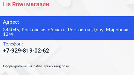 Lis Rowi, магазин по адресу 344045, Ростовская область, Ростов-на-Дону, Миронова, 12/4 в дальнейшем Организация, размещена в следующих категориях: