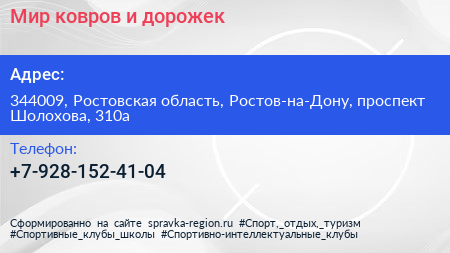 Мир ковров и дорожек по адресу 344009, Ростовская область, Ростов-на-Дону, проспект Шолохова, 310а в дальнейшем Организация, размещена в следующих категориях:
