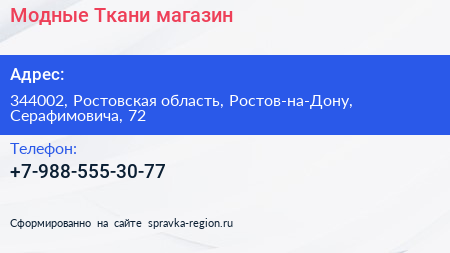 Модные Ткани, магазин по адресу 344002, Ростовская область, Ростов-на-Дону, Серафимовича, 72 в дальнейшем Организация, размещена в следующих категориях: