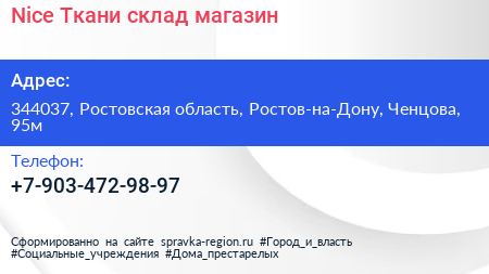 Nice Ткани, склад-магазин по адресу 344037, Ростовская область, Ростов-на-Дону, Ченцова, 95м в дальнейшем Организация, размещена в следующих категориях: