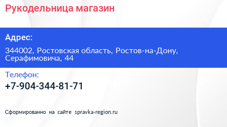 Рукодельница, магазин по адресу 344002, Ростовская область, Ростов-на-Дону, Серафимовича, 44 в дальнейшем Организация, размещена в следующих категориях: