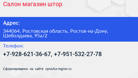 Салон-магазин штор по адресу 344064, Ростовская область, Ростов-на-Дону, Шеболдаева, 95а/2 в дальнейшем Организация, размещена в следующих категориях: