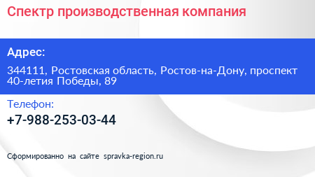 Спектр, производственная компания по адресу 344111, Ростовская область, Ростов-на-Дону, проспект 40-летия Победы, 89 в дальнейшем Организация, размещена в следующих категориях: