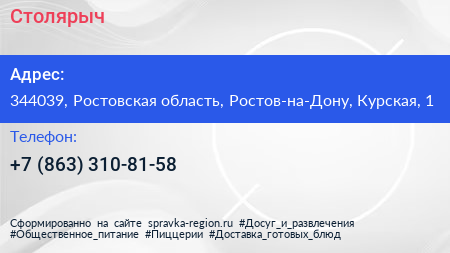 Столярыч по адресу 344039, Ростовская область, Ростов-на-Дону, Курская, 1 в дальнейшем Организация, размещена в следующих категориях: