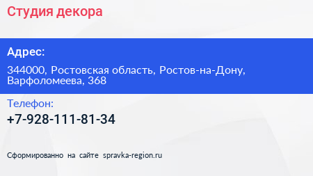 Студия декора по адресу 344000, Ростовская область, Ростов-на-Дону, Варфоломеева, 368 в дальнейшем Организация, размещена в следующих категориях: