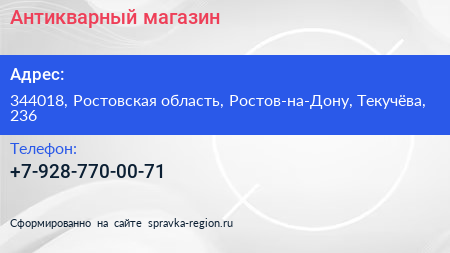 Антикварный магазин по адресу 344018, Ростовская область, Ростов-на-Дону, Текучёва, 236 в дальнейшем Организация, размещена в следующих категориях: