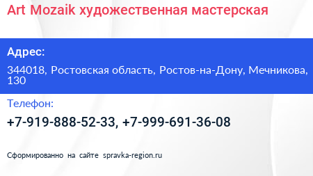 Art Mozaik, художественная мастерская по адресу 344018, Ростовская область, Ростов-на-Дону, Мечникова, 130 в дальнейшем Организация, размещена в следующих категориях: