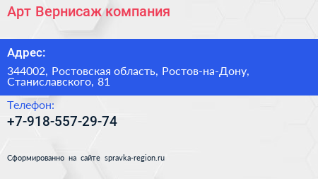 Арт Вернисаж, компания по адресу 344002, Ростовская область, Ростов-на-Дону, Станиславского, 81 в дальнейшем Организация, размещена в следующих категориях: