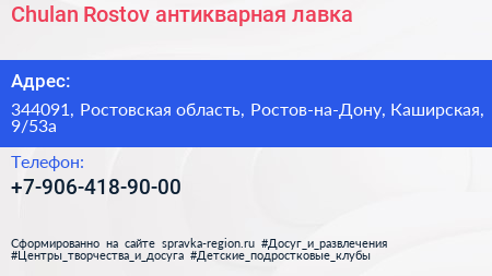 Chulan Rostov, антикварная лавка по адресу 344091, Ростовская область, Ростов-на-Дону, Каширская, 9/53а в дальнейшем Организация, размещена в следующих категориях: