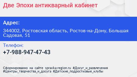 Две Эпохи, антикварный кабинет по адресу 344002, Ростовская область, Ростов-на-Дону, Большая Садовая, 51 в дальнейшем Организация, размещена в следующих категориях:
