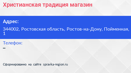 Христианская традиция, магазин по адресу 344002, Ростовская область, Ростов-на-Дону, Пойменная, 1 в дальнейшем Организация, размещена в следующих категориях: